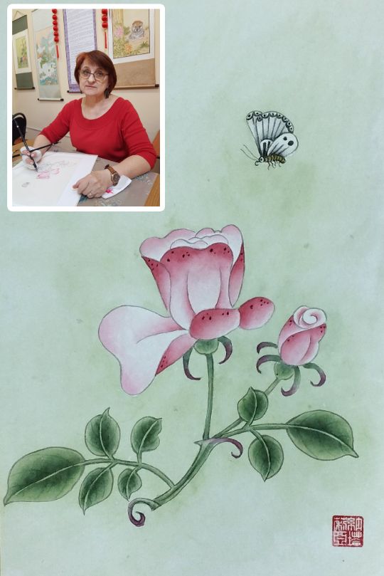 На протяжении этого времени Вы познакомитесь с техническими приемами этой уникальной живописи и с волшебными материалами (тончайшей рисовой бумагой, китайскими красками и кистями), с помощью которых напишете небольшую, но очень позитивную картину «Роза и бабочка». Замечательный благопожелательный сюжет, символизирующий радостную счастливую любовь, часто сопровождаемую благословением и духовным ростом, выражает пожелание счастья, долгой жизни и любовных успехов.