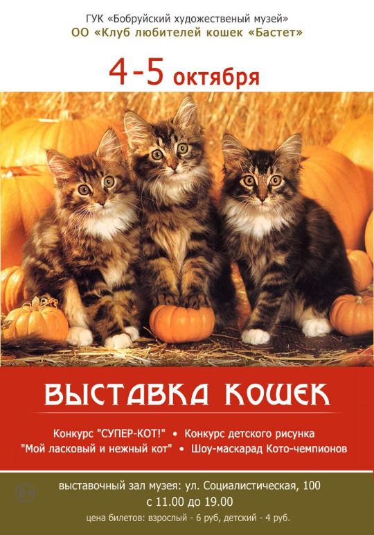 Впервые в Бобруйске своё творчество демонстрируют участники светлогорского клуба "Креатив" (руководитель - Александра Вадимовна Малаева). Выставка "Усы в красках" приурочена ко Всемирному дню защиты животных, и откроется в рамках выставки кошек, которая будет проходить в выставочном зале музея 4-5 октября.