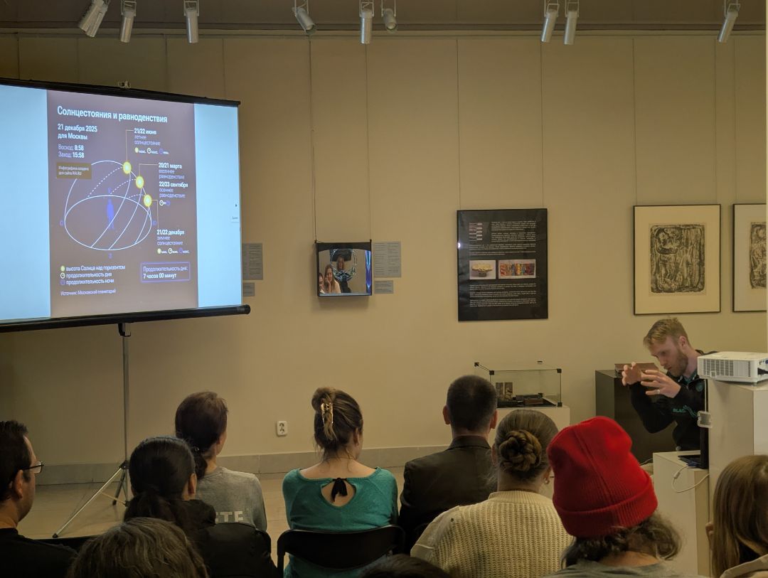 Встречу Денис начал с примечательного факта: его выставка открылась в день зимнего солнцестояния, а творческая встреча проходит в день весеннего равноденствия.