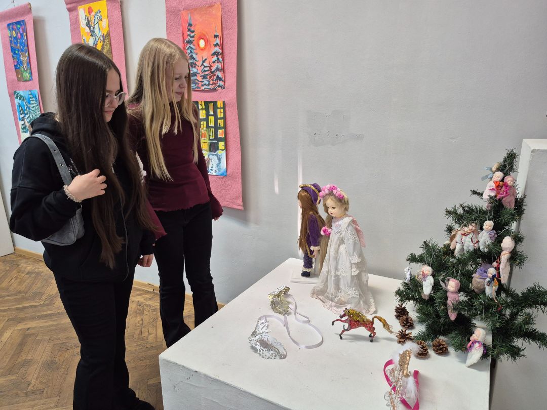 В выставочном зале представлены игрушки и авторские куклы Натальи Ковалевой и ее учеников. Наталья Филипповна ведет в ГУК «Центр дополнительного образования детей и молодежи г. Бобруйска» творческое объединение по интересам «Кукломания». Талантливая мастерица и прекрасный педагог, член общественного объединения «Белорусского союза мастеров народного творчества», Наталья Ковалева обучает своих учеников видеть прекрасное и творить его своими руками. Работы детей выполнены в разных техниках и из самых разных материалов: текстиль, войлок, папье-маше, нитки, холодный фарфор - все это превращается в забавных зверюшек, милых мультяшных героев, утонченных кукол, элегантных мишек «Тэдди». В этот раз педагог со своими учениками снова удивили, сделав яркие и очень необычные елочные игрушки.